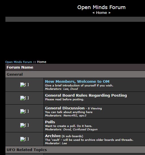 The Open Minds Forum was a popular UFO Proboards discussion forum online until about the beginning of 2012. It included numerous posts discussing UFO reports and Disclosure issues. It included several "Special Guests" boards featuring material from various UFO researchers, including John Lear, Ron Schmidt ("Zorgon"), Dan Smith, Angelia Joiner and others. Popular topics included SERPO, members of the Aviary, the California Drone / CARET photographs, Source A, and many other UFO incidents/issues.
